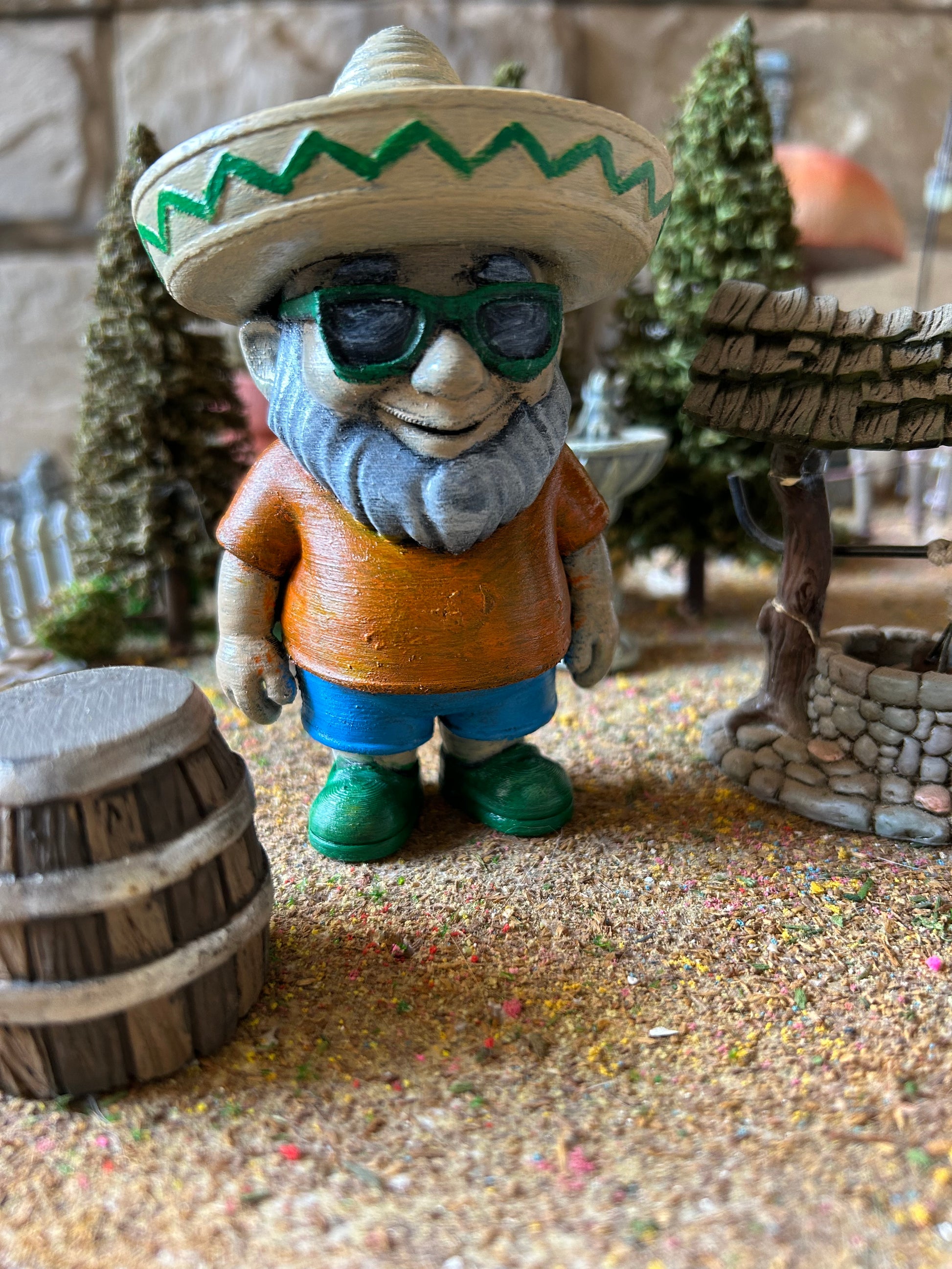 Bright, cheerful, and ready for a fiesta, this gnome with his wide sombrero brings sunshine and joy wherever he rests. Perfect for adding a playful splash of color to your garden, he’s a natural entertainer—whether lounging by the cacti or dancing among the daisies.