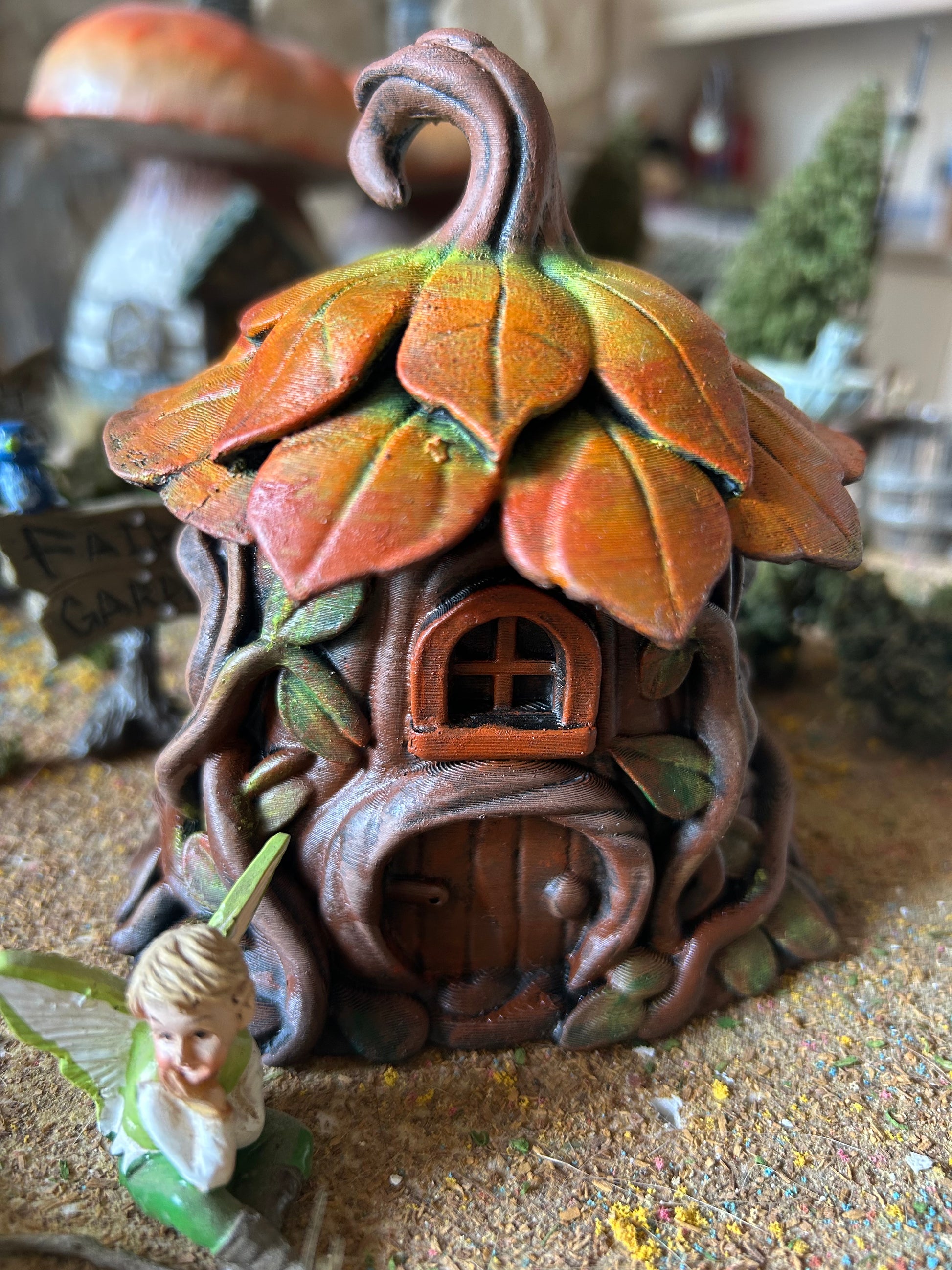 Bring a touch of woodland magic to your fairy garden with this charming Enchanted Leaf Cottage. Crafted to look as though it’s grown straight from the forest floor, the house features a whimsical roof of layered autumn leaves, twisting vines that embrace its walls, and a rounded wooden door that beckons tiny folk inside. A small paned window glows with cozy warmth, perfect for any fairy, gnome, or woodland sprite looking for a snug hideaway.