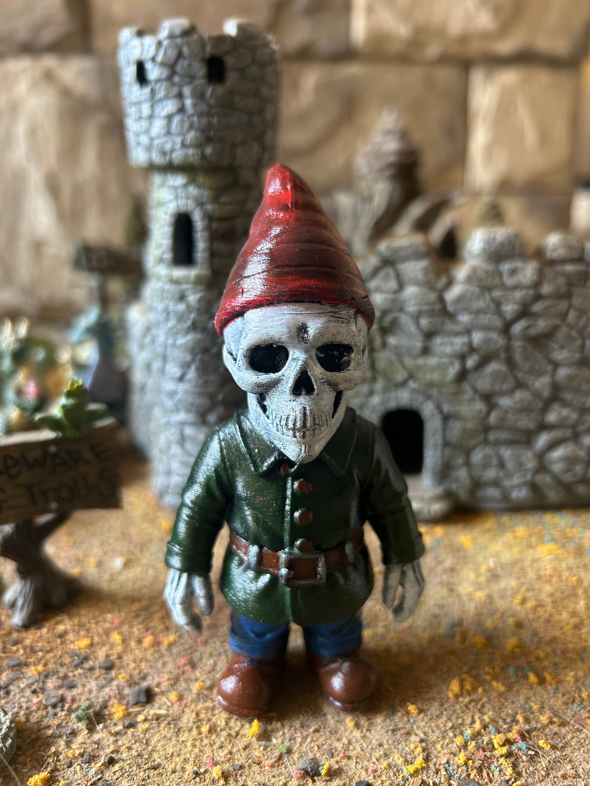 Introducing Bonesworth, the Halloween gnome who lost his flesh but not his flair. With his bony grin, hollow eyes, and a jaunty gnome hat perched proudly atop his skull, he’s proof that even the afterlife can’t keep a good gnome down.