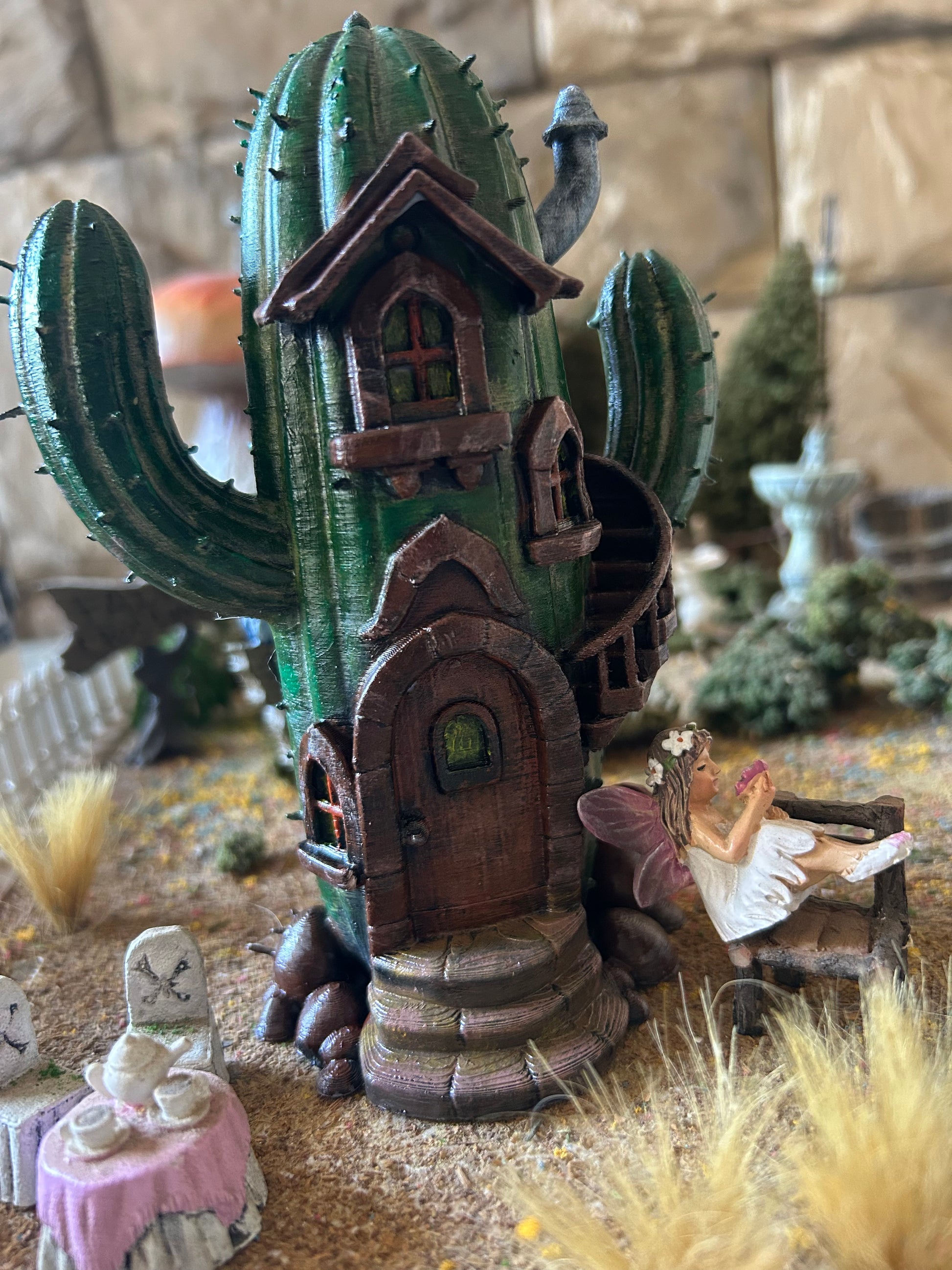 Rising proud among sunlit stones, Spinecrest Retreat is no ordinary desert dwelling. Its walls are bristled with protective spines, said to guard the fair folk within from wandering hands and curious eyes. By day, it soaks up the golden warmth of the sun, and by night, its tiny windows flicker with cool green light, like fireflies trapped in crystal. Travelers whisper that fairies of the cactus are hardy and mischievous—fond of riddles, pranks, and guiding lost wanderers in circles until dawn.