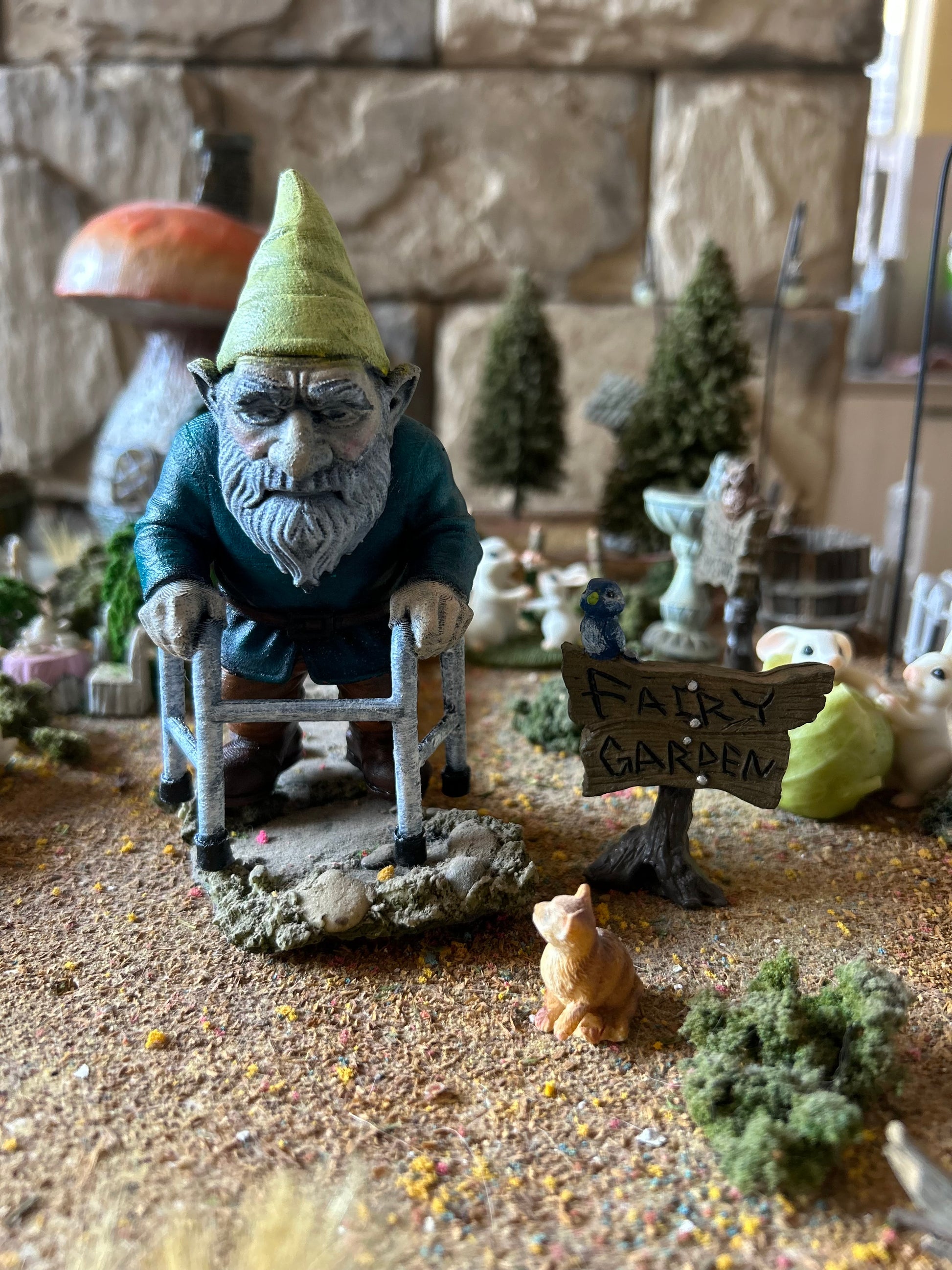 Every village needs its wise old gnome, and this one comes complete with a trusty walker and decades of stories tucked under his pointy hat. Gramps MacPebble with his walker may move a little slower these days, but he’s still the heart (and humor) of the garden.