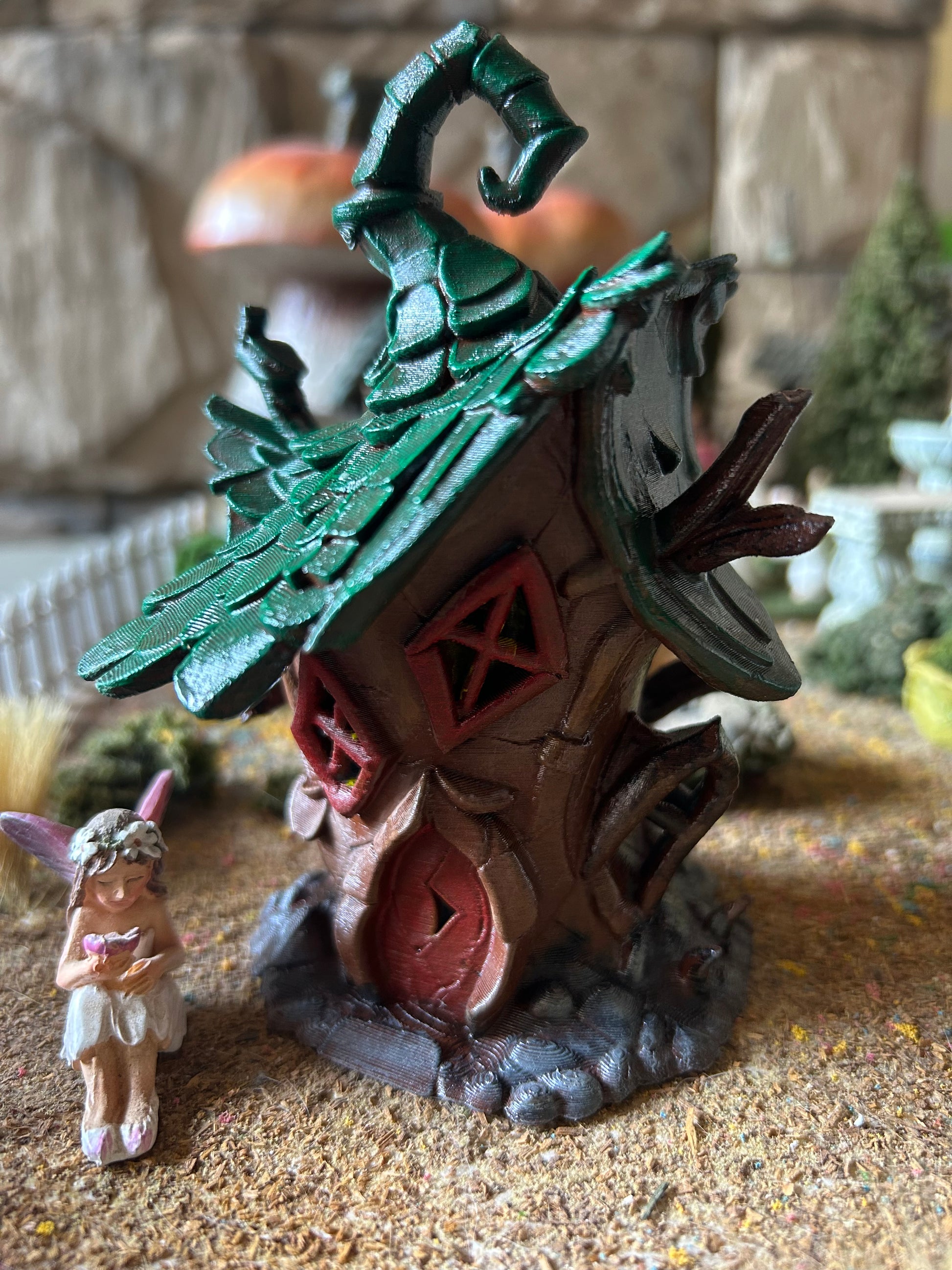 Not all fairies are sugar-sweet and flower-soft—some like things a little… stranger. Perched high among the branches, Twilight Tangle Treehouse is the perfect haunt for mischief-makers who enjoy moonlit pranks, whispering winds, and giving garden visitors a playful shiver. With crooked windows, twisty roots, and shadows that never quite sit still, it’s said that brave fairies come here to test their courage.