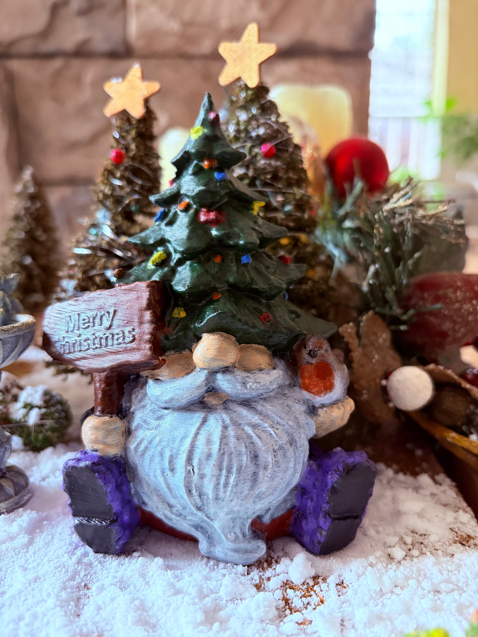 Warning: Gnome-folk tales whisper that a gnome crowned with a living tree is a keeper of festive wishes. Each night, his tiny lights are said to glow with the dreams of those nearby. But be warned: leave him unattended without a pinch of winter greenery, and he may send his robin friend fluttering about to “collect” decorations from other parts of your home. A happy Tree-Hat Gnome brings harmony and good cheer — but a neglected one is known to rearrange ornaments until the room feels “just right.”