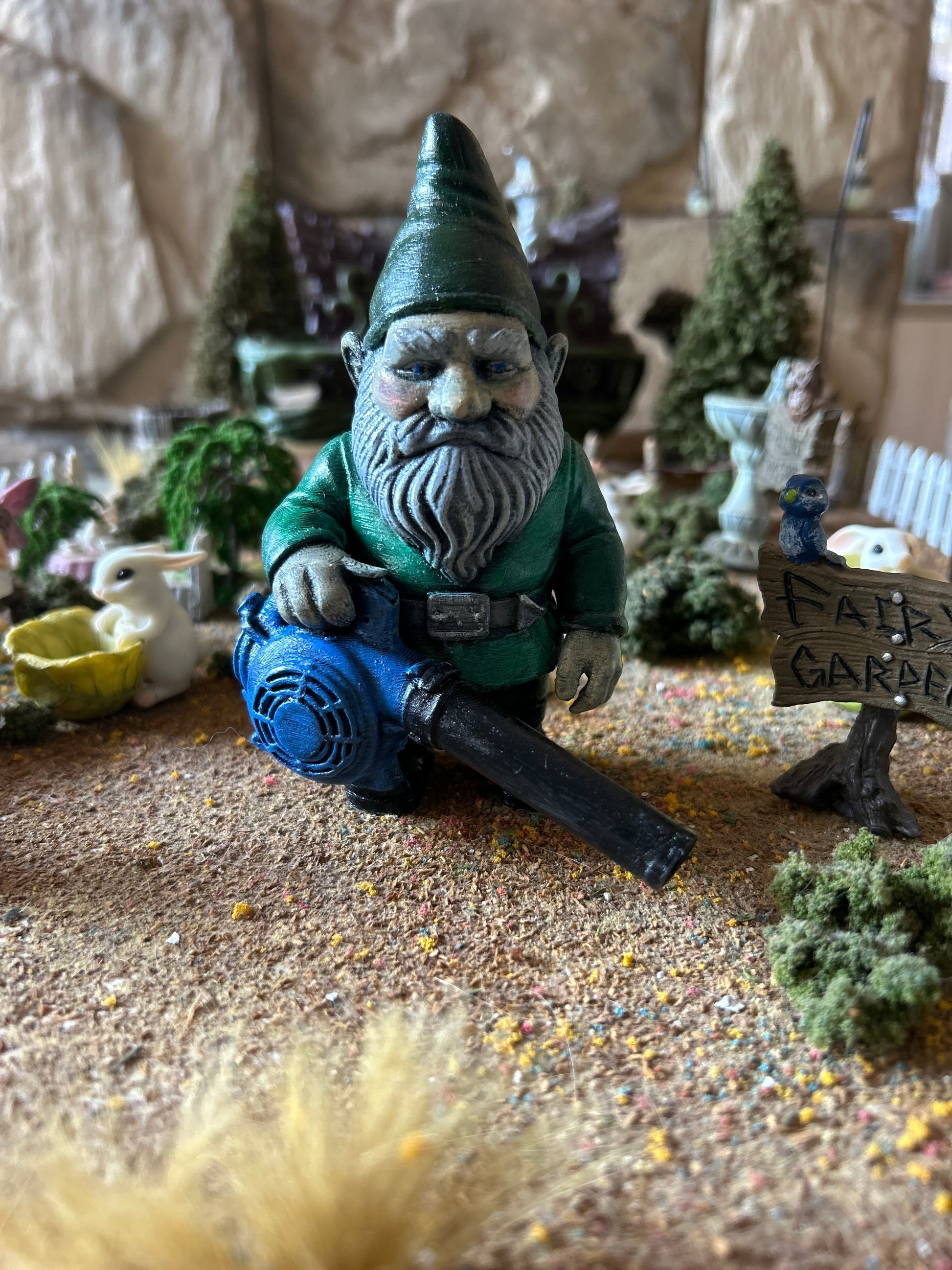 This hardworking little guy has traded in his fishing pole and mushroom seat for some serious garden gear! Blowbert is on a mission to keep your flowerbeds tidy and your lawn looking sharp. With his trusty blower in hand and a determined look on his face, he’s ready to tackle autumn, or at least look like he is.