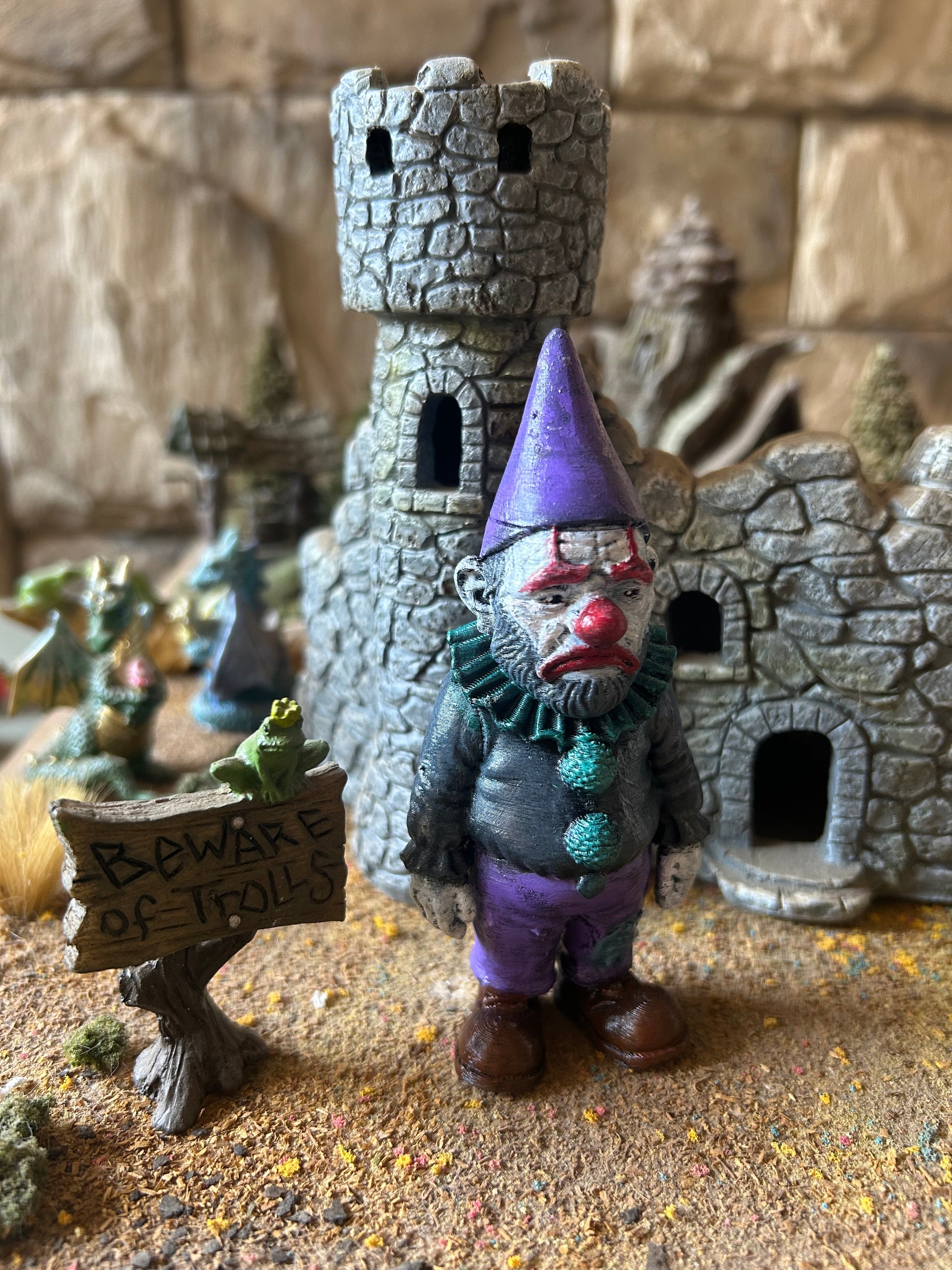 Step right up… or maybe step carefully back. Melancholy McGiggles is the Halloween gnome who never quite found the punchline. With his long, purple hat, painted red nose, and somber clown-like face, he carries a haunted charm that’s equal parts whimsical and unsettling.