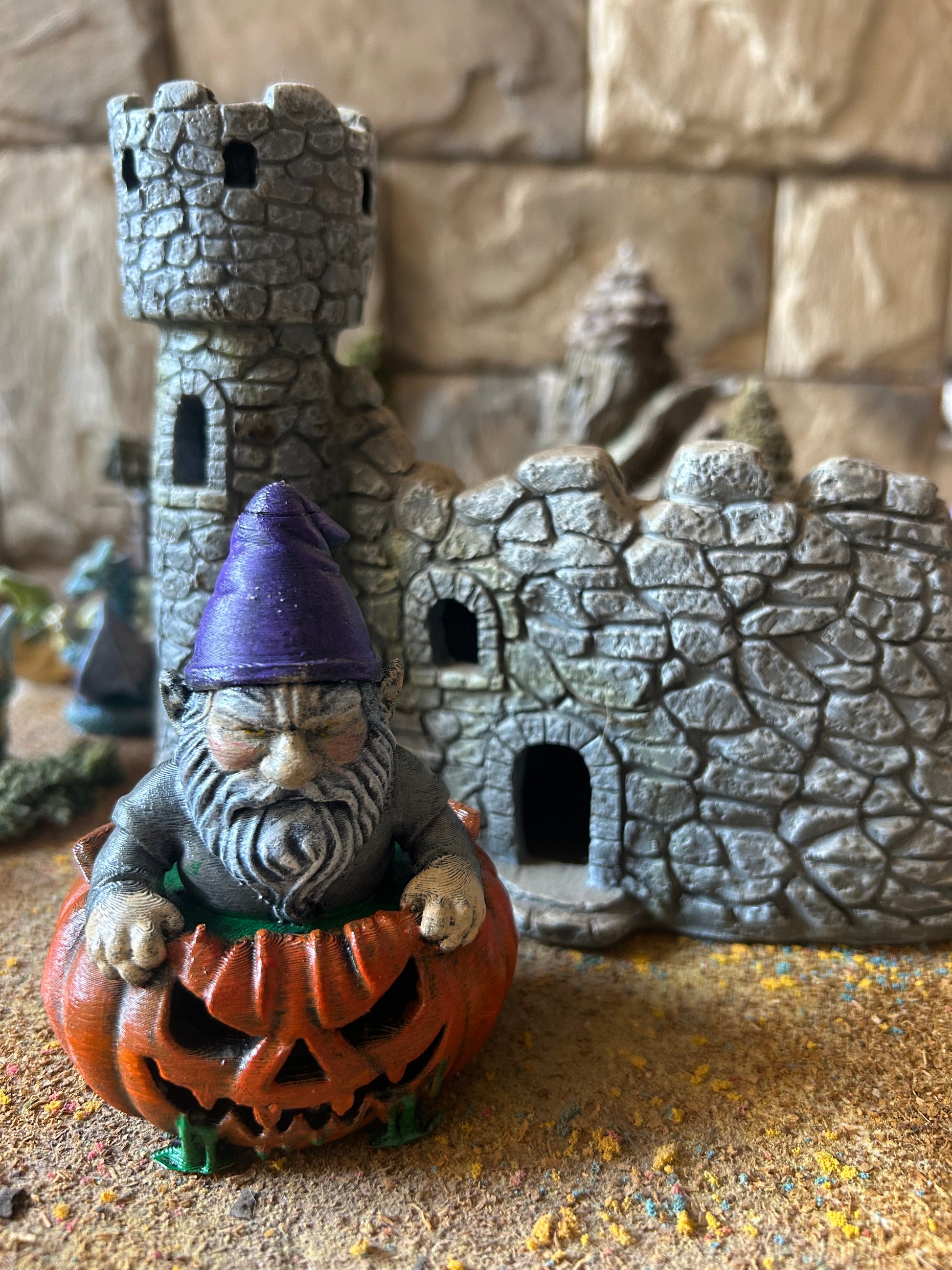 Meet Pumpkin Pete, the Halloween gnome who decided that trick-or-treating is overrated—so he moved right into a pumpkin instead! With his purple hat pulled low, a bristly beard, and a pair of mischievous eyes peeking out, Pete has claimed his jack-o’-lantern home as the coziest (and spookiest) seat in the patch.