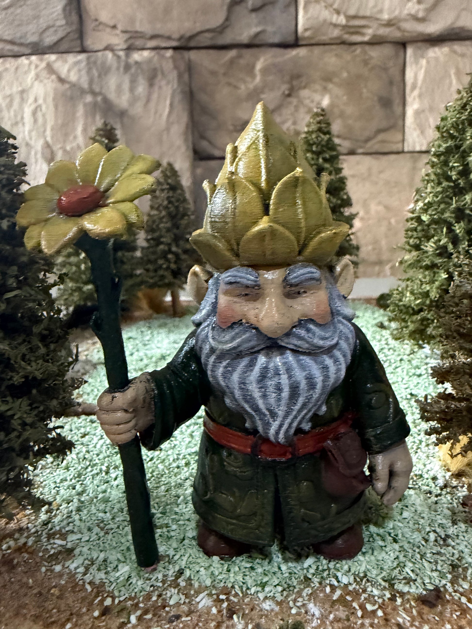 This cheerful gnome wields a sunflower as tall as himself, using it as both a staff and a beacon of sunny optimism. Wherever he wanders, flowers seem to follow, and his sunny disposition brightens even the gloomiest corners of the garden.